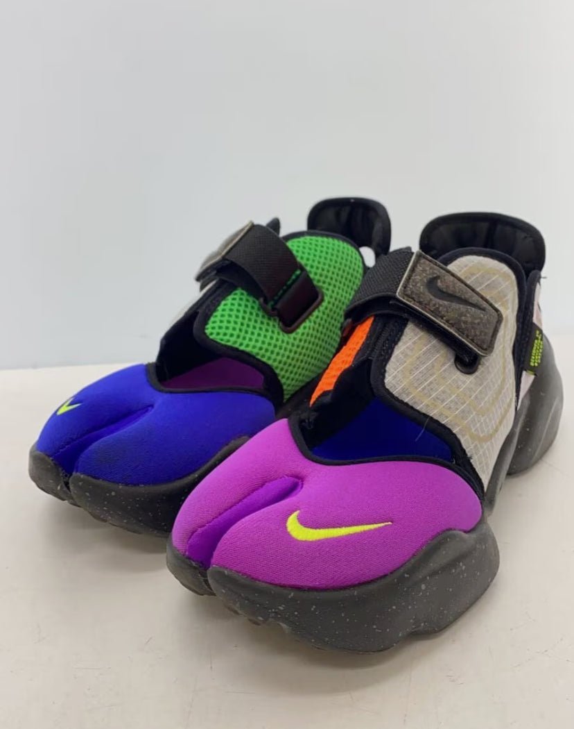 Shop Nike Aqua Rift unisex sneakers in Black/Pink, Orange, Blue/Pink & White/Blue/Orange—split-toe designs with neoprene uppers and velcro straps. Sizes 3-9. ’90s beach style revived.